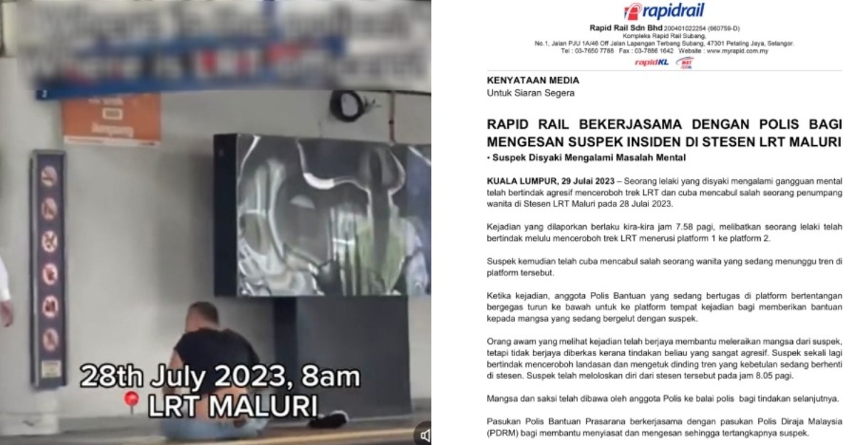 Seorang lelaki sedang dikesan selepas didakwa bertindak agresif menceroboh trek LRT dan cuba mencabul salah seorang penumpang wanita di Stesn LRT Maluri pada 28 Julai lalu.