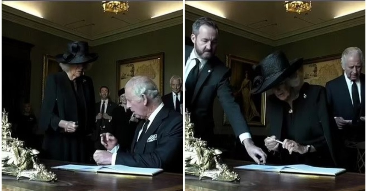 Pen yang rosak telah ditukar dengan pantas dan digantikan oleh pegawai istana yang bingung sebelum Ratu Camilla duduk dan menandatangani buku itu sendiri menggantikan Raja di kediaman bersejarah tersebut.