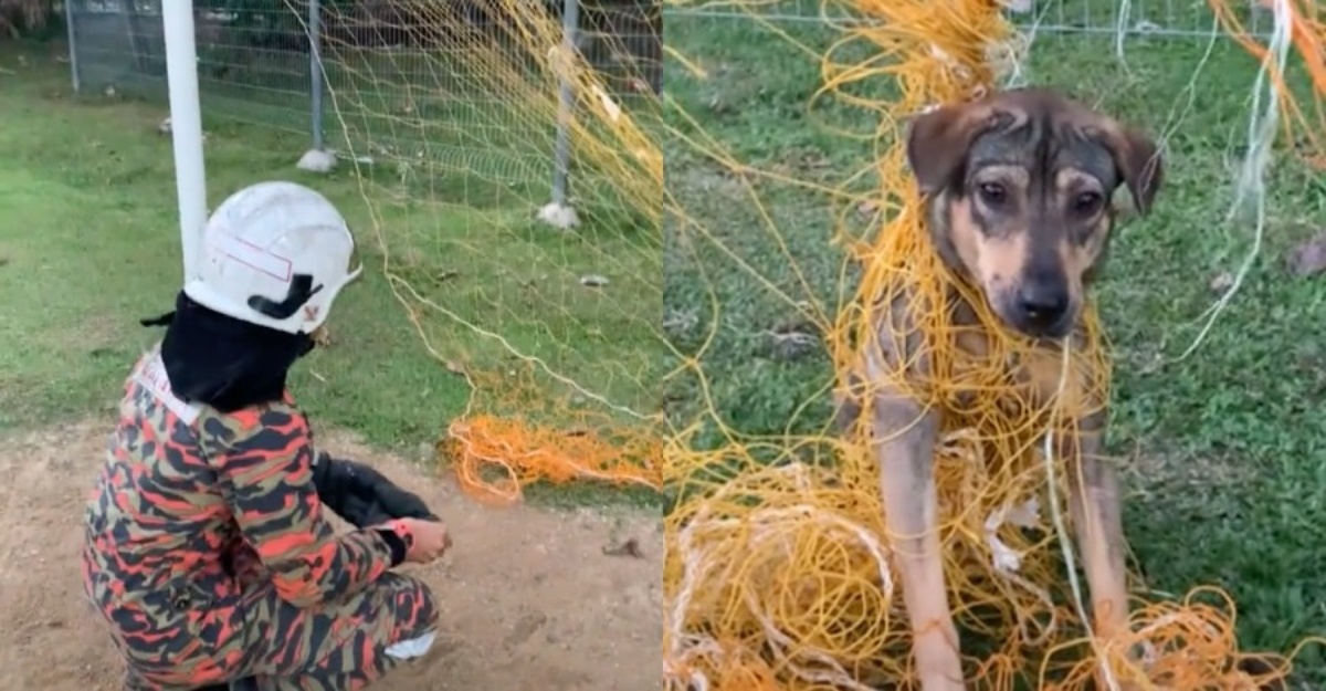 Muka Pasrah, Bomba Selamatkan Anjing Tersangkut Pada Jaring Gol