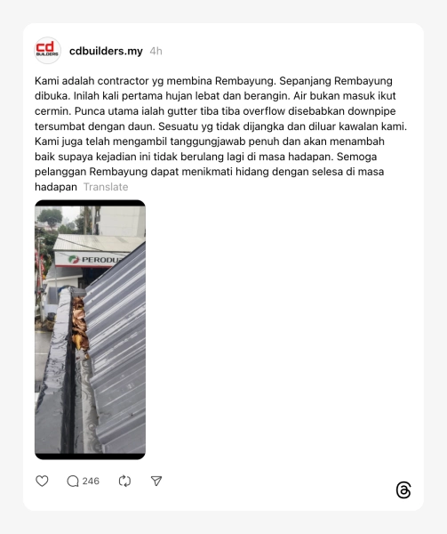 Menerusi hantaran di Threads oleh @cdbuilders.my, pihak kontraktor menjelaskan bahawa kejadian tersebut berlaku bukan kerana air memasuki premis melalui cermin, sebaliknya disebabkan sistem gutter tiba-tiba melimpah apabila downpipe tersumbat dengan daun.