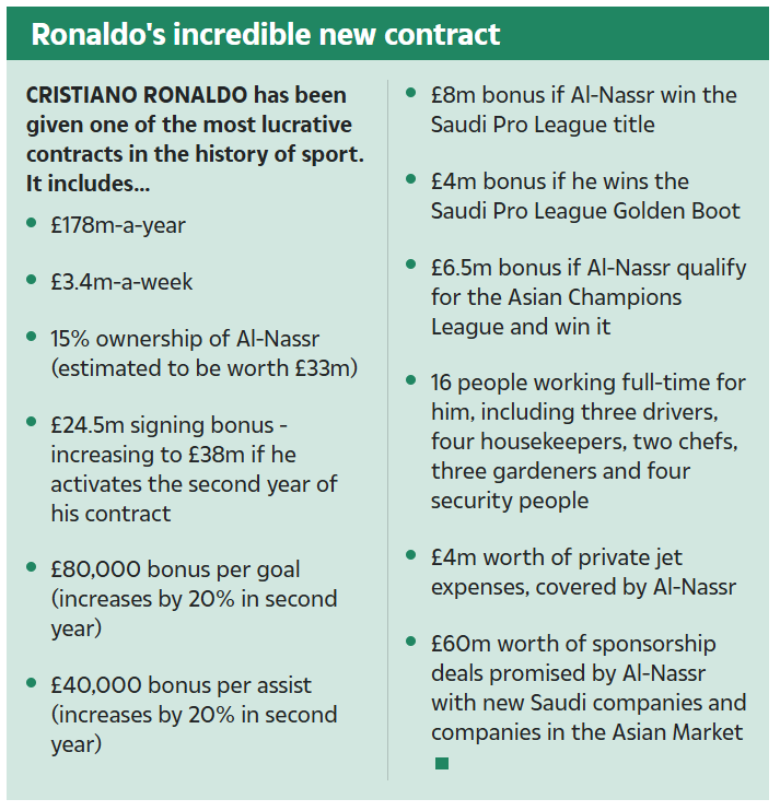 Ronaldo turut diberikan 15 peratus pegangan saham dalam kelab, dianggarkan bernilai £33 juta, serta pelbagai insentif lain termasuk bonus £4 juta jika memenangi anugerah Kasut Emas dan £8 juta jika membantu Al-Nassr menjuarai liga.