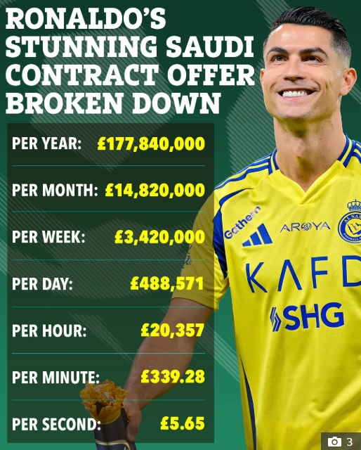 Difahamkan, kontrak dua tahun itu dianggarkan bernilai £492 juta (kira-kira RM2.86 bilion), dengan gaji asas £488,000 (RM2.83 juta) sehari. Perjanjian tersebut juga menyaksikan Ronaldo kekal di Al-Nassr sehingga usia 42 tahun.