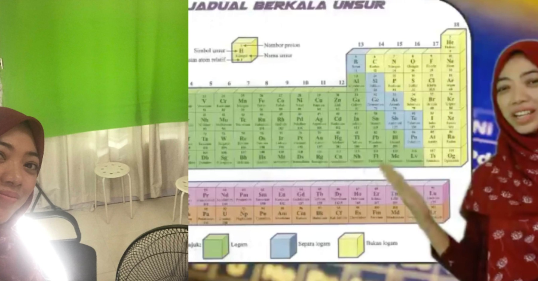 Cikgu Siti Faridah berkongsi menggunakan kaedah unik dengan teknik skrin hijau (green screen) bagi memudahkan mengajar murid-muridnya dengan hasil visual yang lebih baik.