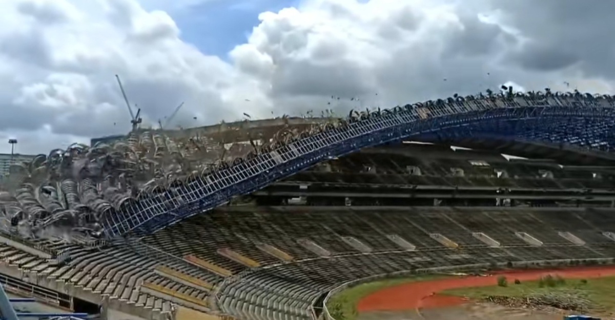Menerusi sebuah video yang tular di media sosial, kelihatan bumbung stadium berkenaan dirobohkan sekaligus. Pemandangan luar biasa diikuti bunyi runtuhan yang kuat itu kelihatan agak menyeramkan.