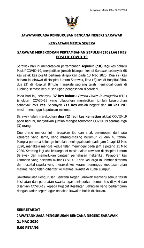 Menerusi kenyataan media ini, pada hari ini sebanyak 37 kes baharu Person Under Investigation (PUI) jangkitan Covid-19 yang dilaporkan menjadikan jumlah keseluruhan sebanyak 751 kes. Bagaimanapun, 711 daripada angka tersebut adalah negatif dan 40 kes PUI masih menunggu keputusan.