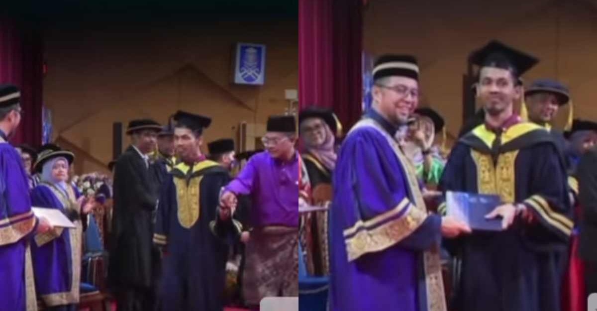 Menerusi klip yang dikongsikan akaun TikTok rasmi UiTM, memaparkan para tetamu kehormat turut berdiri sewaktu dia menaiki pentas sebagai tanda penghormatan di atas usahanya menamatkan pengajian.