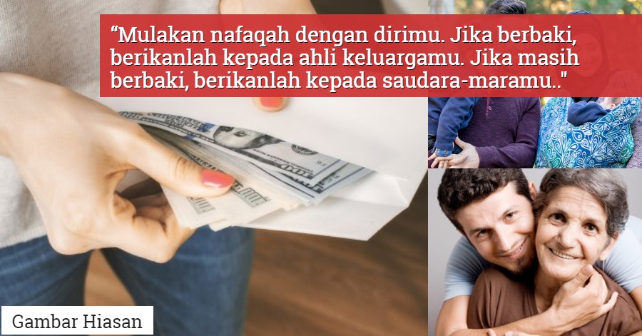 Maksudnya: “Mulakan nafaqah dengan dirimu. Jika berbaki, berikanlah kepada ahli keluargamu. Jika masih berbaki, berikanlah kepada saudara-maramu yang terdekat dan jika masih berbaki lagi, berikanlah kepada mereka dan seterusnya.”