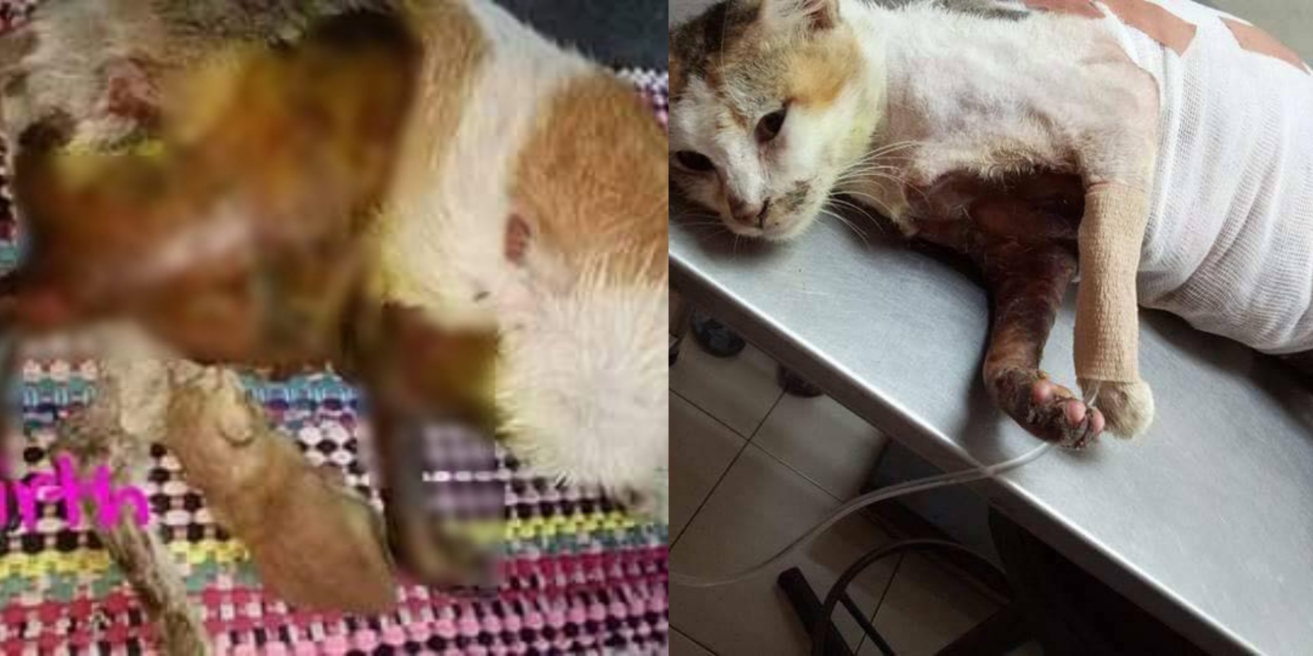 Jika dilihat menerusi gambar berkenaan, hampir separuh badan ibu kucing itu melecur sehingga menyebabkannya kehilangan bulu-bulunya.