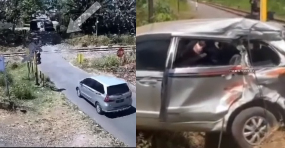 Sebuah kereta Toyota Avanza dirempuh kereta api selepas cubaan untuk melintasi landasan kereta api di Banyuwangi, Indonesia gagal, lapor Detik.com.