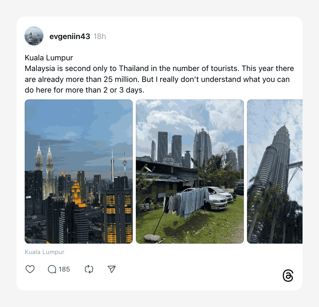 Menerusi hantaran @evgeniin43 di Threads, lelaki itu berkongsi beberapa gambar ketika hanya mengunjungi kawasan bandar Kuala Lumpur dan pusat membeli-belah yang dipenuhi bangunan pencakar langit moden, membuatkannya berasa pengalaman yang dirasai agak terbatas.