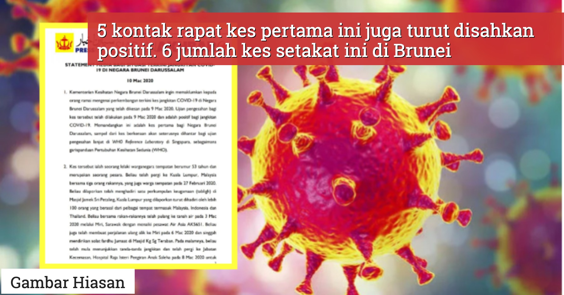 Dalam satu laporan khas media daripada Kementerian Kesihatan Brunei mengesahkan seorang lelaki berusia 53 tahun yang baru pulang dari Kuala Lumpur pada 3 Mac 2020 lalu.