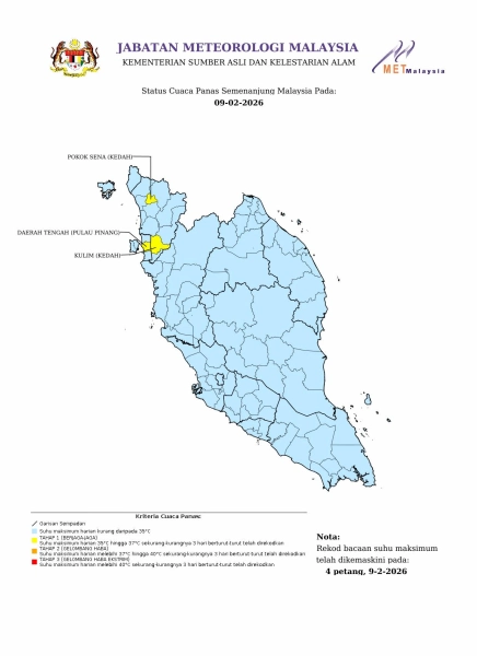 "Suhu maksimum harian 35-37 darjah Celsius sekurang-kurangnya selama tiga hari berturut-turut," ujar MetMalaysia.