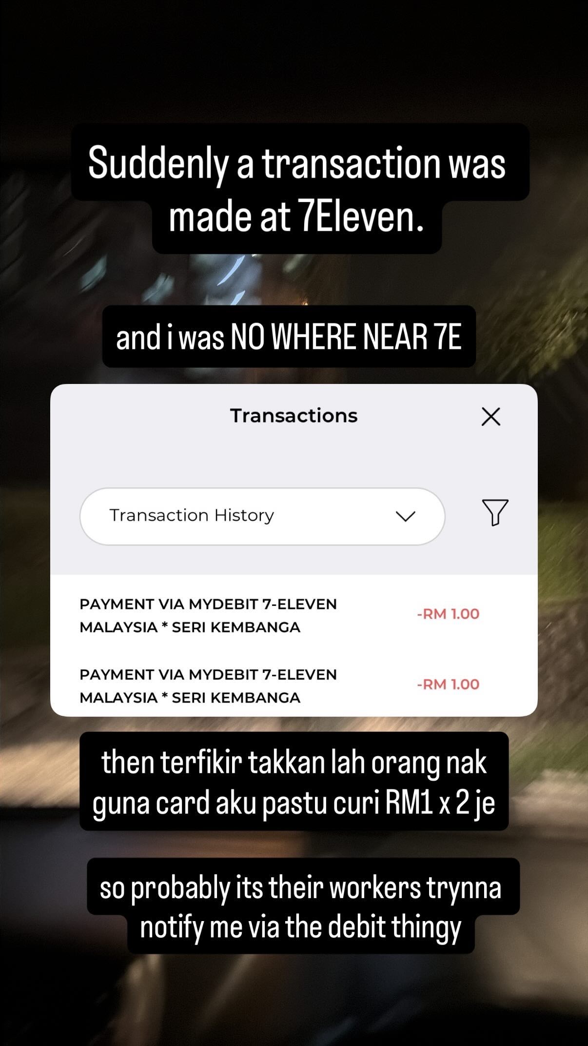 Bagaimanapun, sewaktu memeriksa akaun banknya (secara online) dia menyedari terdapat transaksi pembayaran mencurigakan dilakukan di sebuah kedai 7 Eleven.