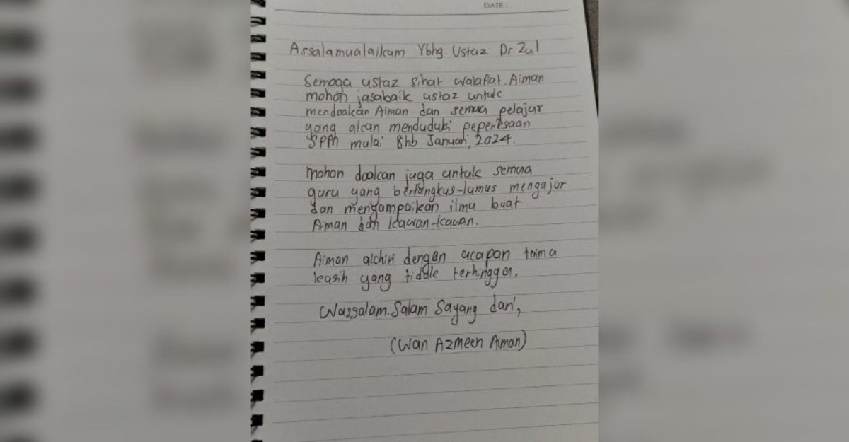 “Assalamualaikum Yang Berbahagia Ustaz Dr. Zul. Semoga ustaz sihat walafiat. Aiman mohon jasa baik ustaz untuk mendoakan Aiman dan semua pelajar yang akan menduduki peperiksaan SPM mulai 8 Januari 2024.