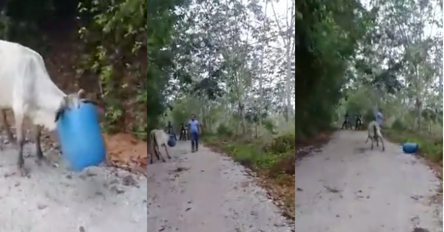 Menerusi video yang dimuatnaik oleh Hermy Rahim di laman Twitter, lelaki tersebut dilihat dengan beraninya membantu seekor lembu yang tersangkut baldi getah.