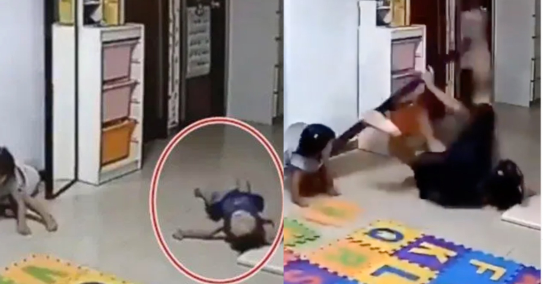 Gambar: TribunnewsCermin tersebut kemudiannya telah terjatuh dan hampir menimpa kanak-kanak yang seorang lagi yang pada ketika itu sedang berguling-guling betul-betul di hadapan cermin itu hendak terjatuh.