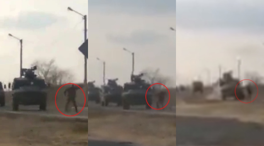 Dalam pada itu, seorang lagi orang awam Ukraine turut dirakam oleh orang awam yang memaparkan saat di mana lelaki itu cuba untuk menghalang barisan tentera Russia.