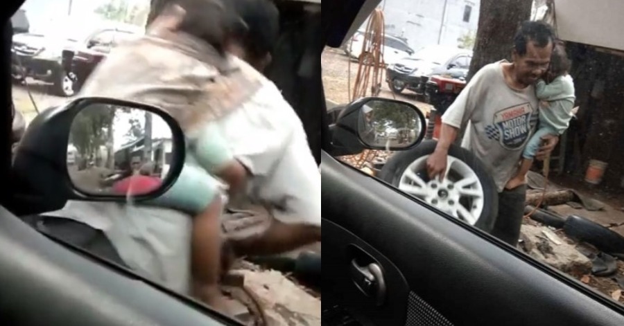 Bapa tunggal tersebut sedang memegang tayar sambil mendukung anaknyaKetika kanak-kanak lain yang seusianya sedang ditatang bagai minyak yang penuh oleh ibu, takdir berbeza yang telah berlaku kepada anak kecil ini.