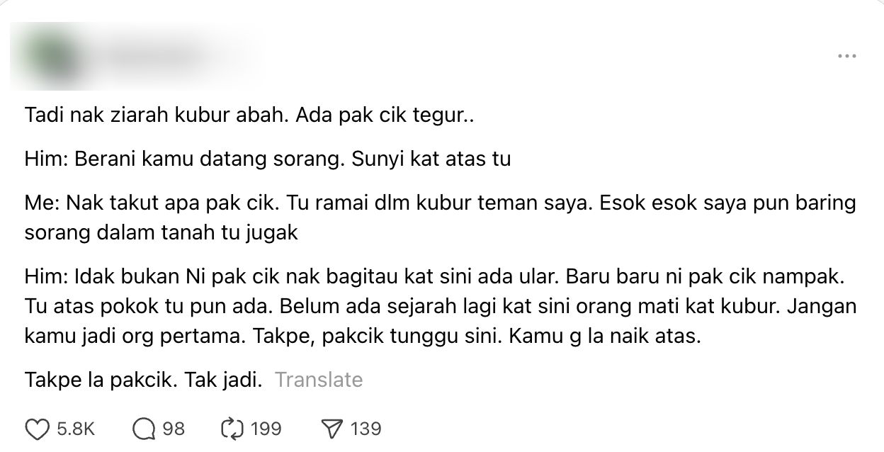 Me: Nak takut apa pak cik? Tu ramai dalam kubur teman saya. Esok-esok, saya pun baring sorang dalam tanah tu juga.