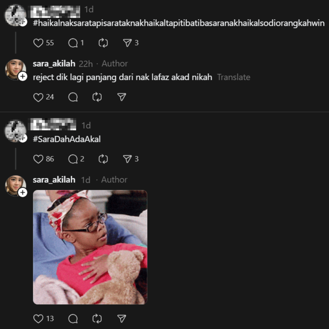 Menerusi hantaran yang dikongsikan oleh @sara_akilah di Threads, wanita itu dilihat berkongsi namanya dan pasangannya.