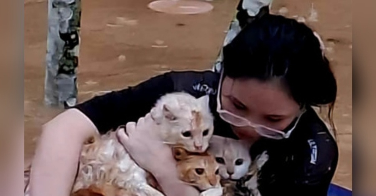 Wanita yang dikenali sebagai Dr Phoebe Ann itu dilihat berjaya menyelamatkan empat ekor kucing peliharaannya dengan menaiki bot penyelamat.